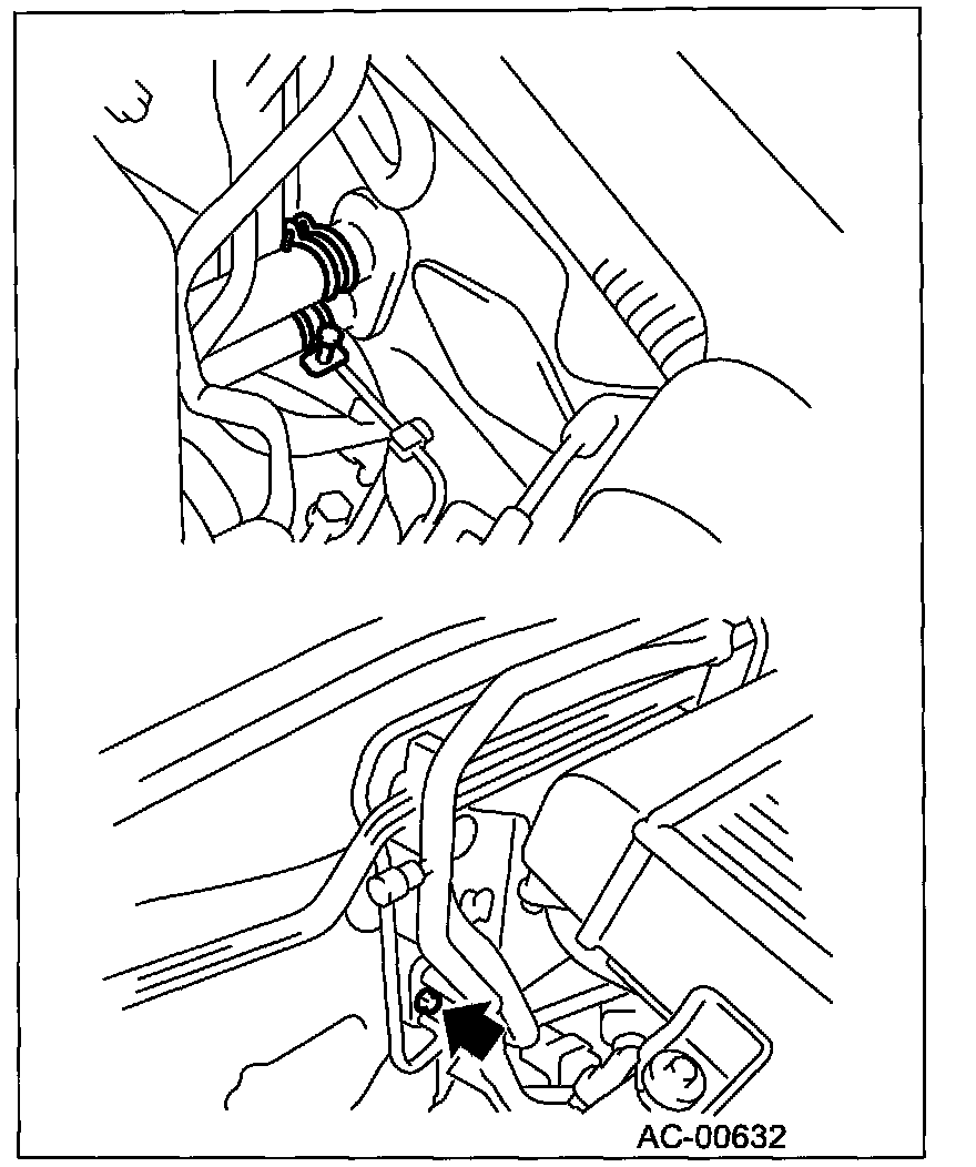 Remove the bolt securing expansion valve and pipe in engine compartment. Release the heater hose clamps in engine compartment to remove the hoses.