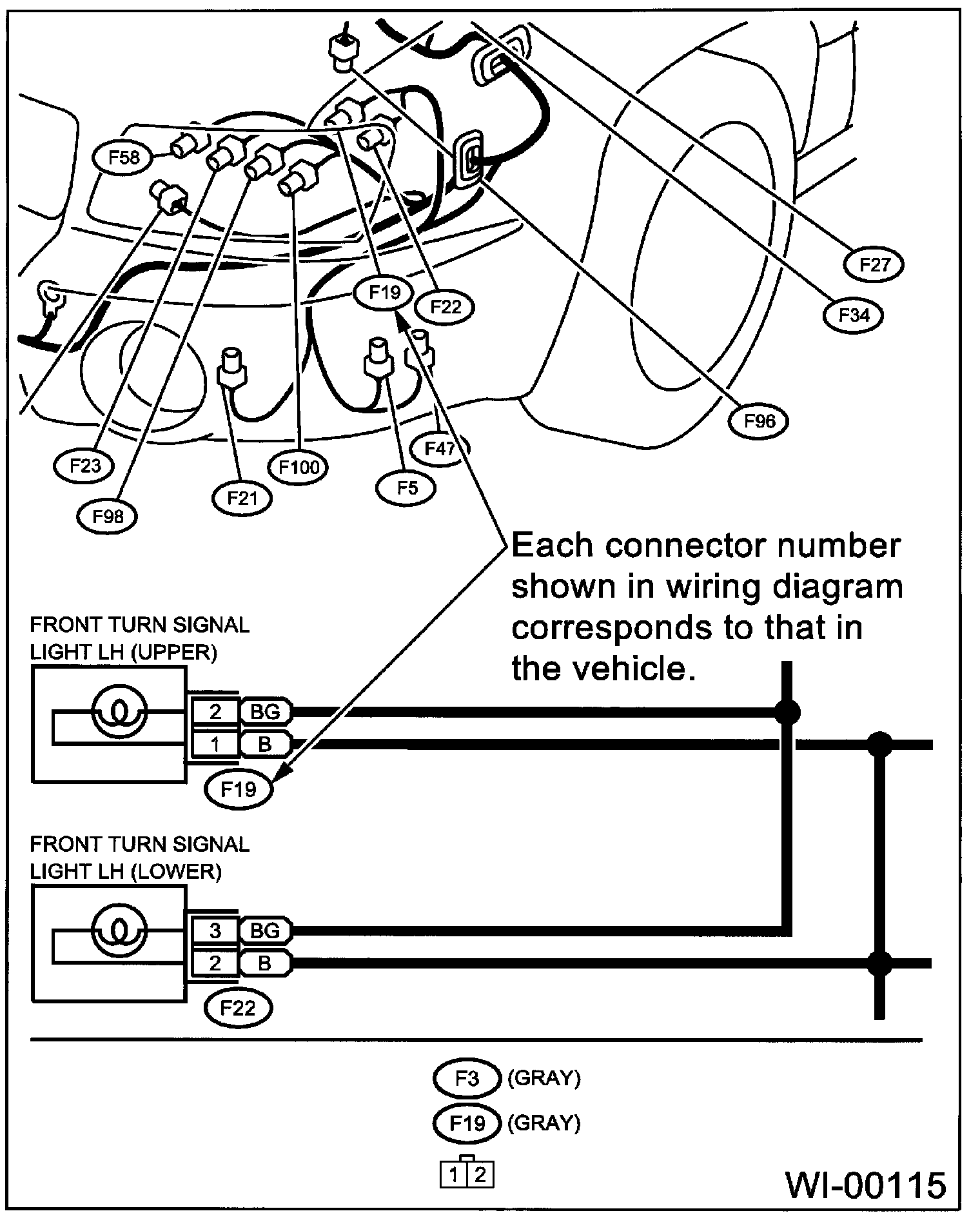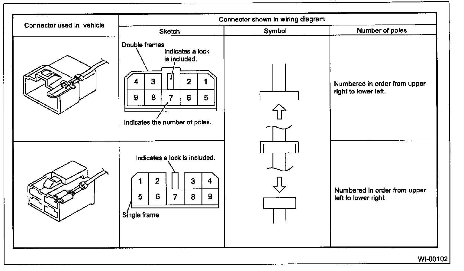 - The sketch of each connector in the wiring diagram usually shows (A) side of the connector. The relationship between wire color, terminal number and connector is described in figure.