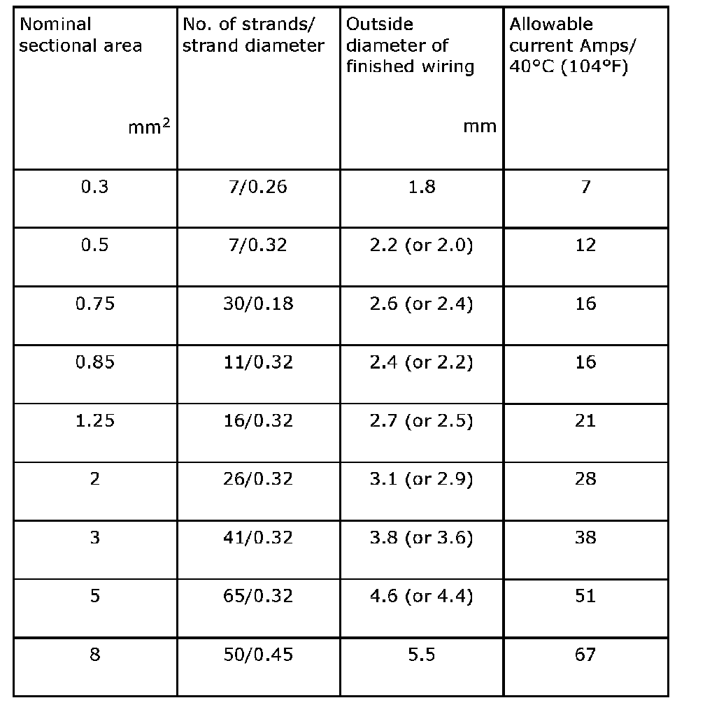 - The allowable current in the table indicates tolerable amperage of each wire at an ambient temperature of 40 degree C (104 degree F).