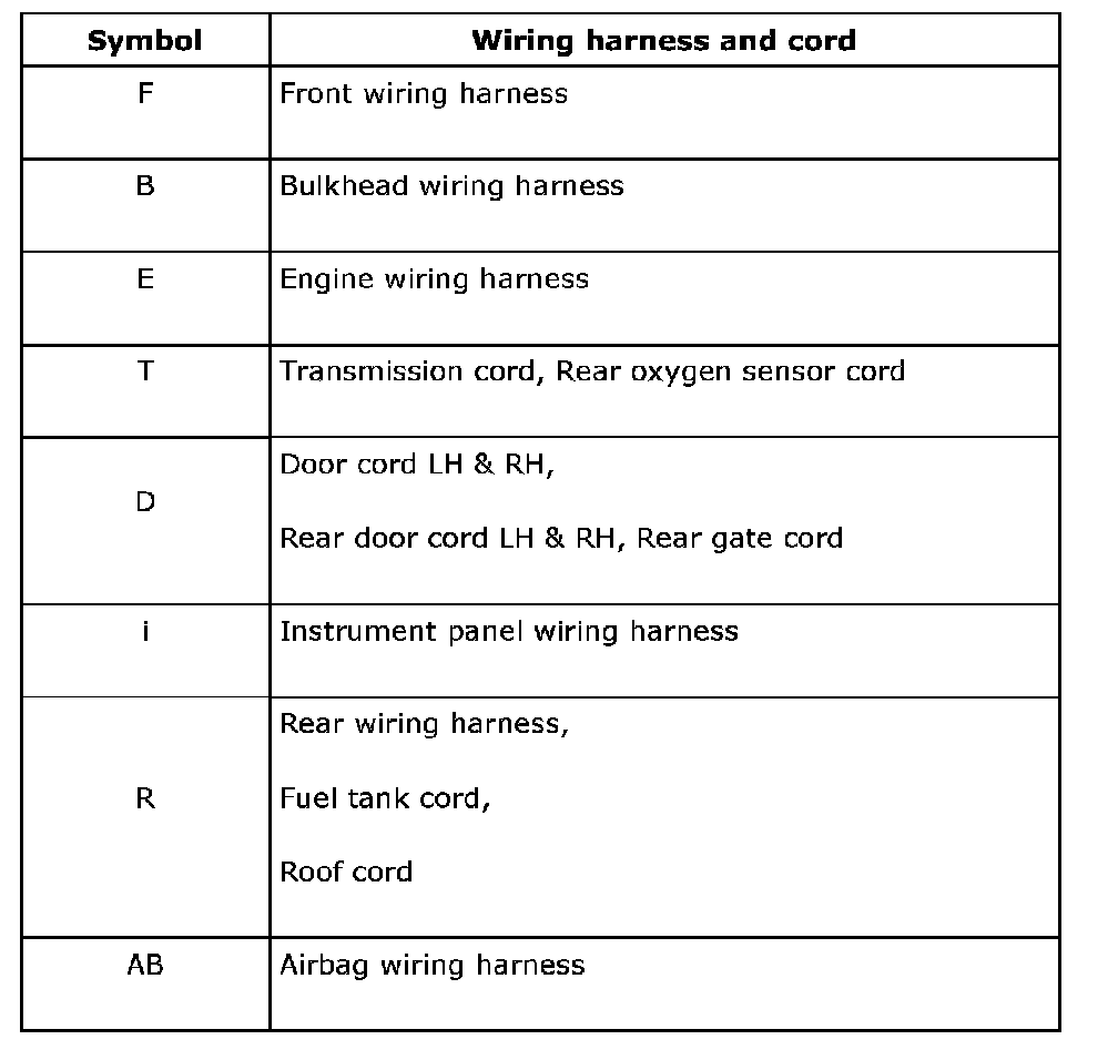 - Each connector number shown in the wiring diagram corresponds to that in wiring harness. The location of each connector in actual vehicle is determined by reading the first character of the connector (for example, a "F" for F8, "i" for i16, etc.) and type of wiring harness. The first character of each connector number refers to the area or system of the vehicle.
