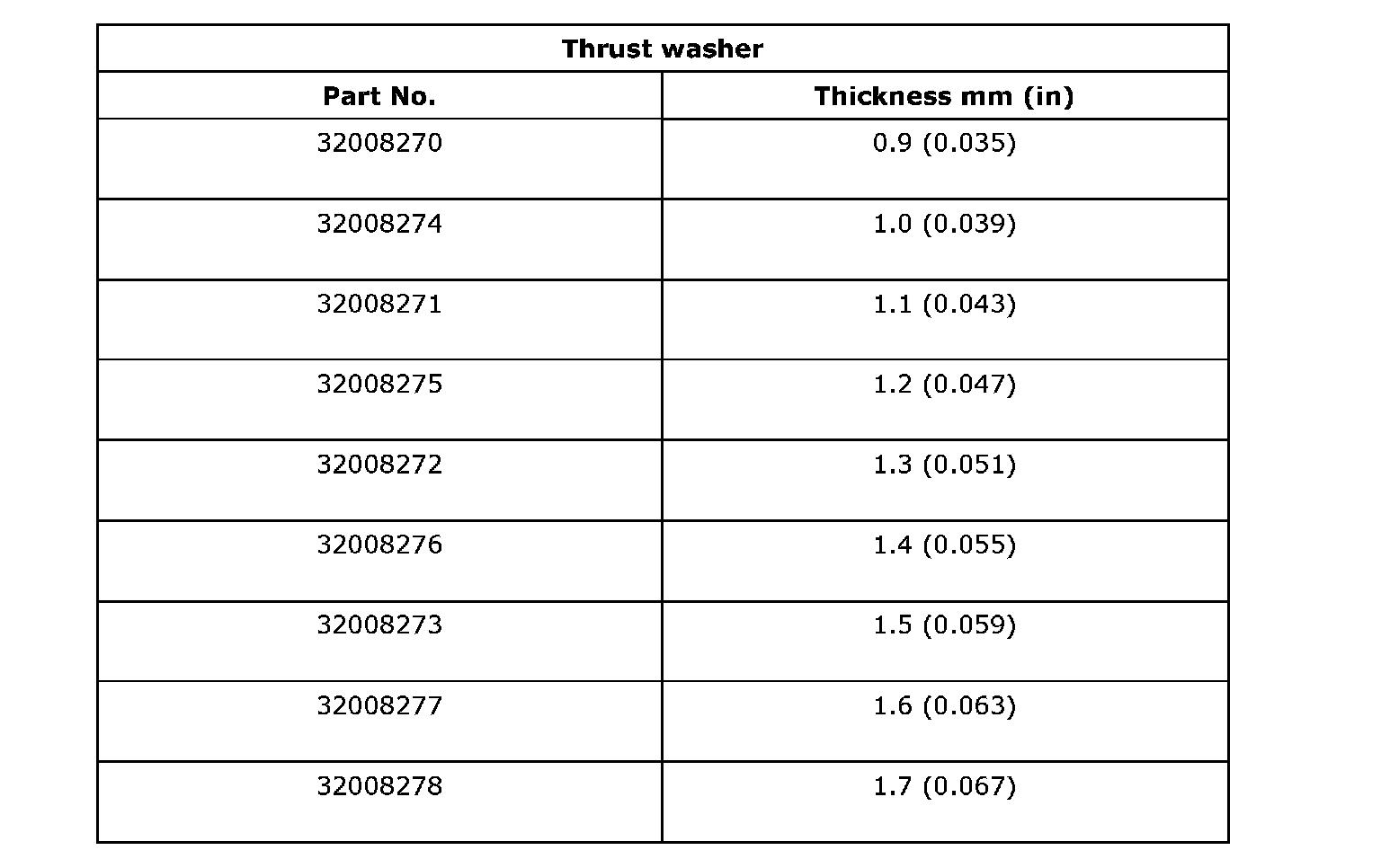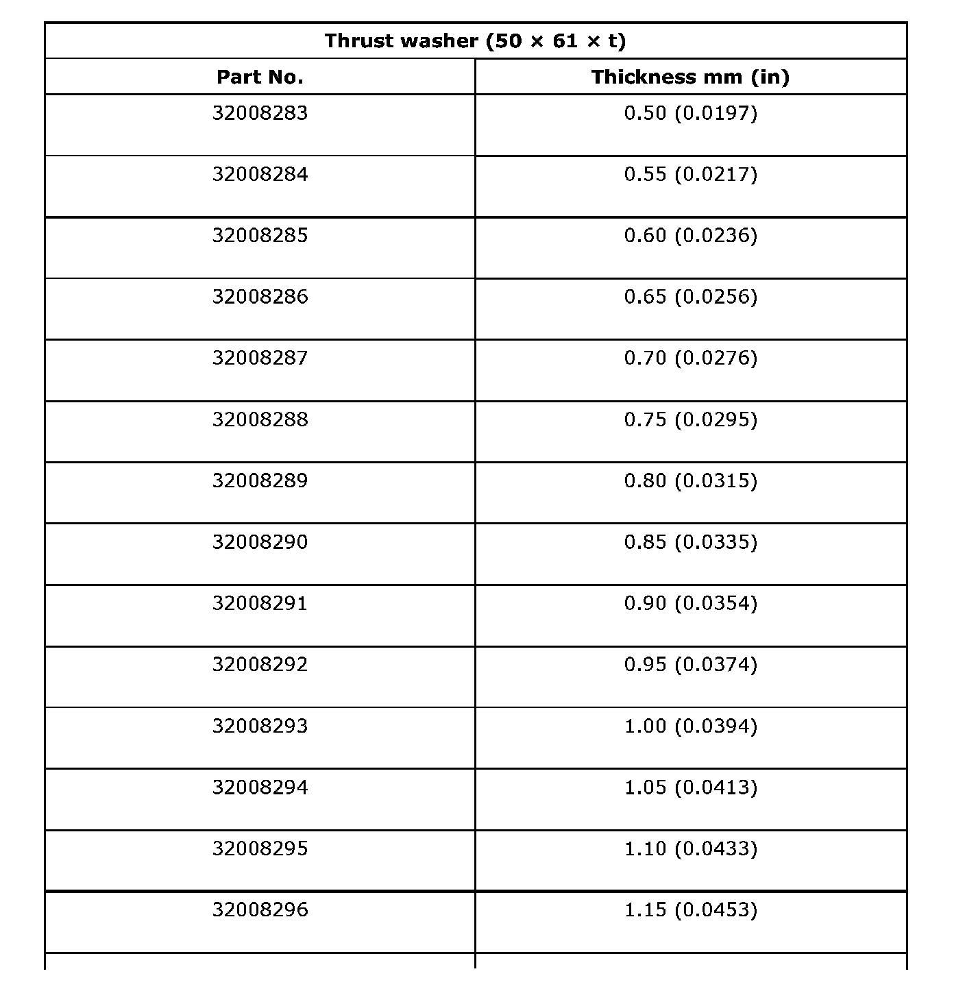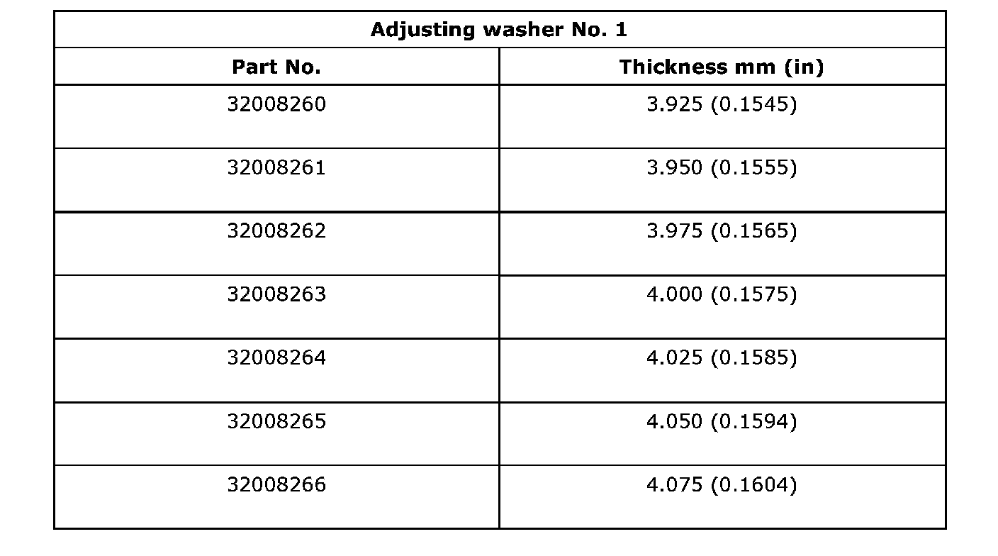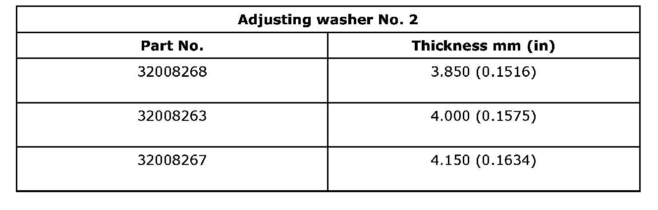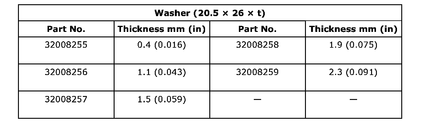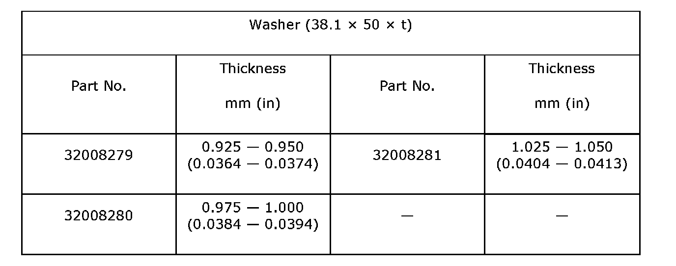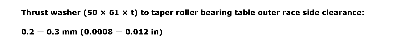 Thrust washer (50 x 61 x t) to taper roller bearing table outer race side clearance 0.2 - 0.3 mm (0.0008 - 0.012 inch)