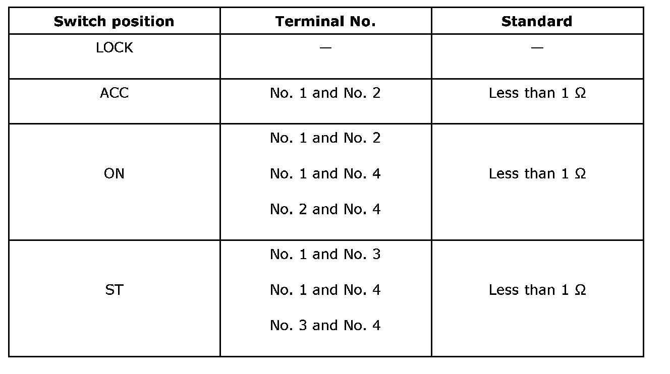 Turn the ignition key plate to each position and check the continuity between terminals of ignition connector.