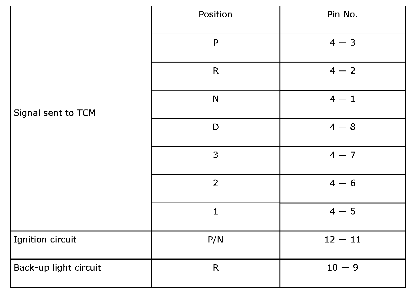 ^ Also check that continuity in ignition circuit does not exist when the select lever is in R, D, 3, 2 and 1 ranges.