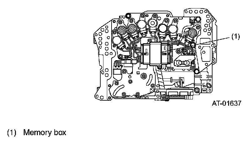 The memory box is mounted on the control valve and stores hydraulic correction values and learned values for the initial shifting pressures for each solenoid, based on its hydraulic characteristics at the time delivered from the factory. The TCM acquires data from this memory box and performs correction based on these data to control each solenoid. This ensures high quality shifting from the time the vehicle was delivered from the factory.