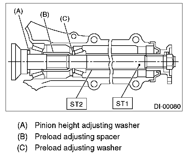 (4) Then install the preload adjusting spacer and washer, front bearing cone, ST2, companion flange, and washer and drive pinion nut.