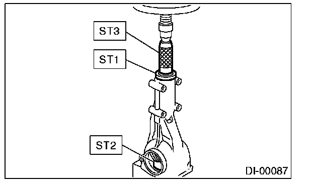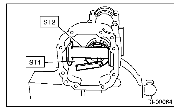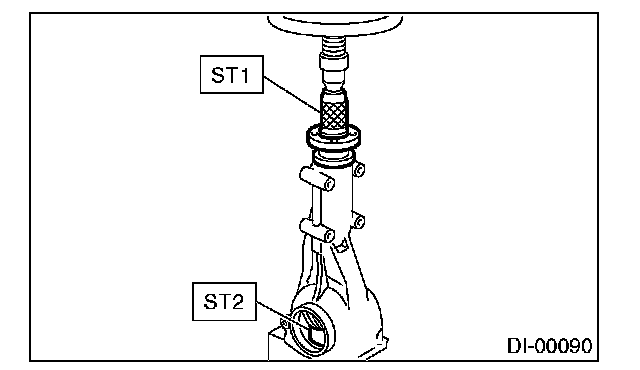 (2) Install the front bearing race to differential carrier using ST1 and ST2.