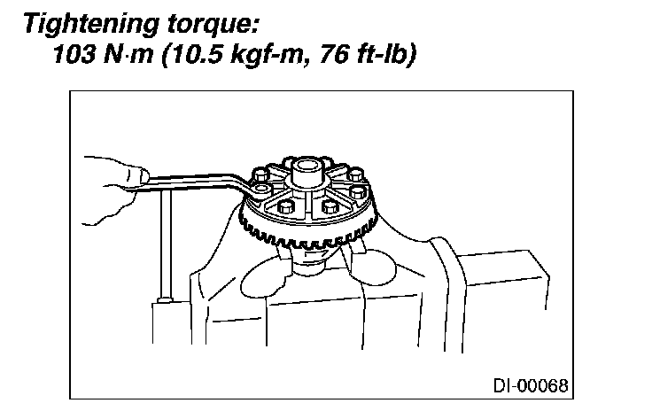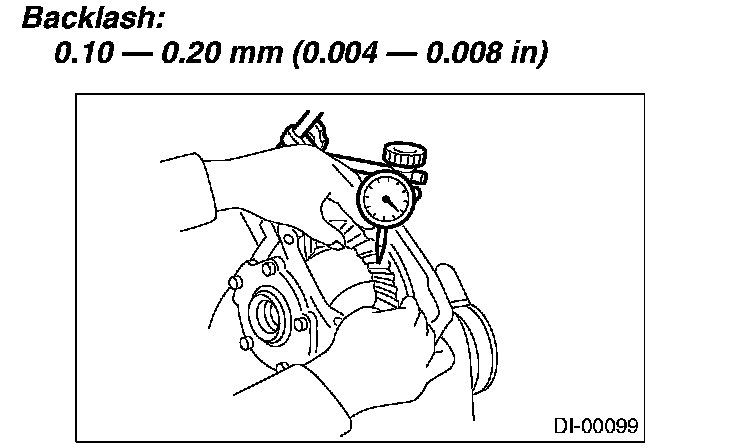 If the backlash exceeds 0.20 mm (0.008 inch), reduce the thickness of shim on the back face of hypoid driven gear and increase the thickness of shim on the tooth face of hypoid driven gear. If the backlash is less than 0. 10 mm (0.004 inch), increase the thickness of shim on the back face of hypoid driven gear and reduce the thickness of shim on the tooth face of hypoid driven gear.