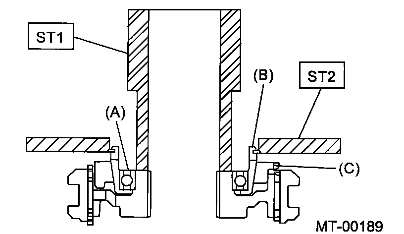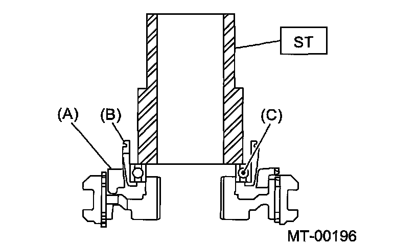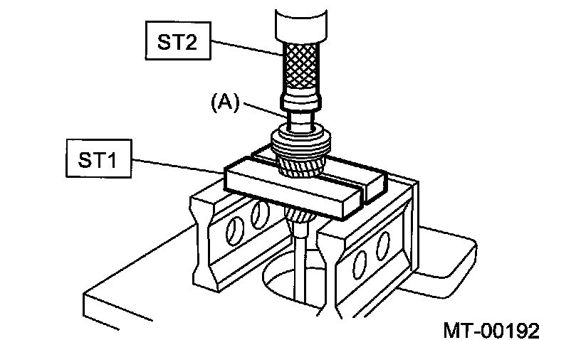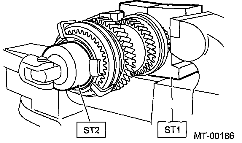 Using the ST1 and ST2, install the 5th gear thrust washer and 5th needle bearing race onto the rear section of transmission main shaft.