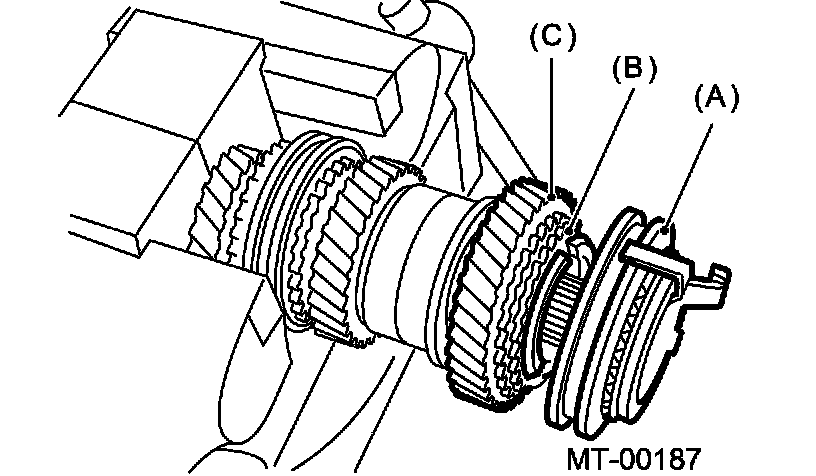 Remove the 5th-Rev sleeve & hub assembly, baulk ring, 5th drive gear and needle bearing.