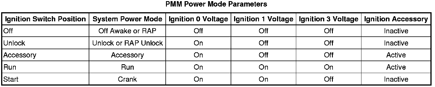 With a scan tool, access the power mode parameters and compare all parameters listed with the corresponding ignition key position. The PMM Power Mode Parameters table below illustrates the correct state of these input parameters in correspondence to the ignition switch position.