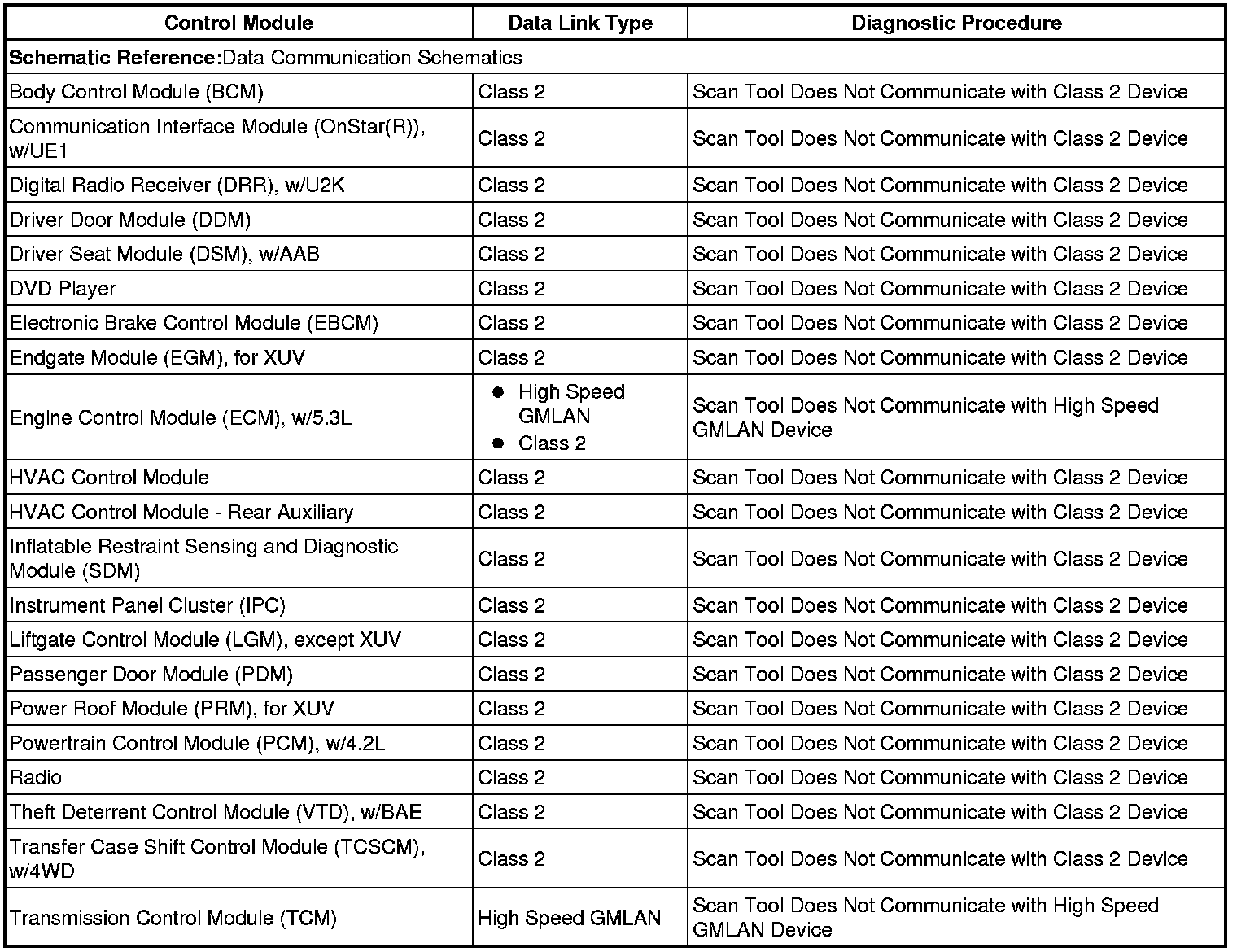This table identifies which serial data link that a particular module uses for in-vehicle data transmission. Some modules may use more than one data link to communicate. Some modules may have multiple communication circuits passing through them without actively communicating on that data link. This table is used to assist in correcting a communication malfunction. For the description and operation of these serial data communication circuits refer to Data Link Communications Description and Operation (Description and Operation).