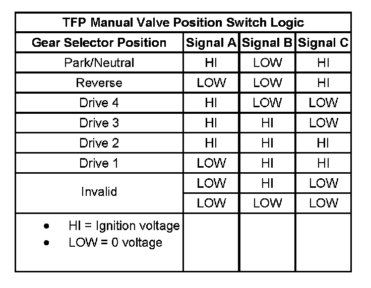 Transmission Fluid Pressure (TFP) Manual Valve Position Switch Logic: