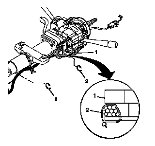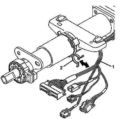 4. Install the wire harness strap (2) to the steering column tilt head assembly (1).