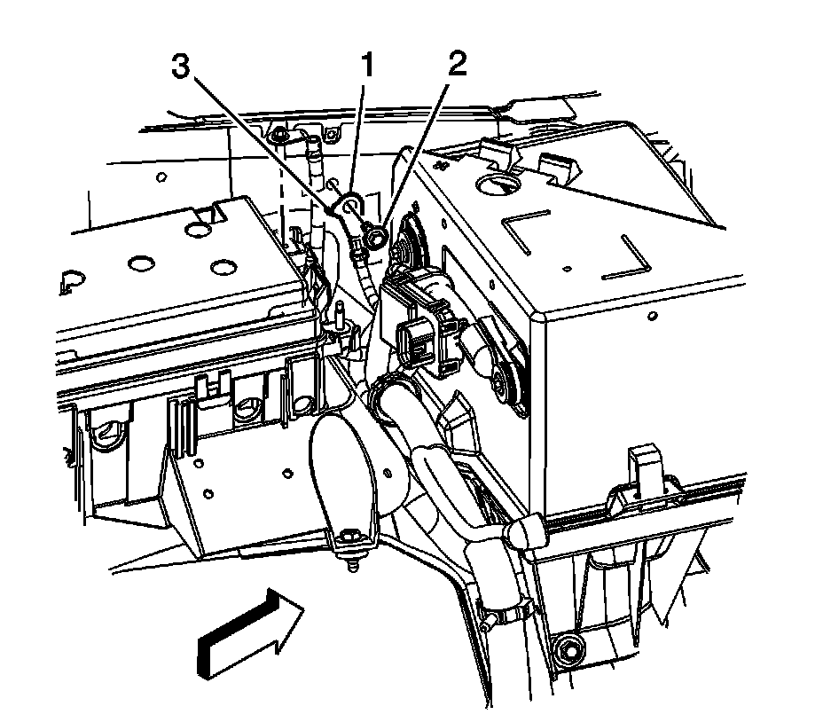 7. Install the negative battery cable ground terminal (1) to the left wheelhouse panel. Ensure that the anti-rotation tab (3) is inserted into the hole in the wheelhouse panel.
