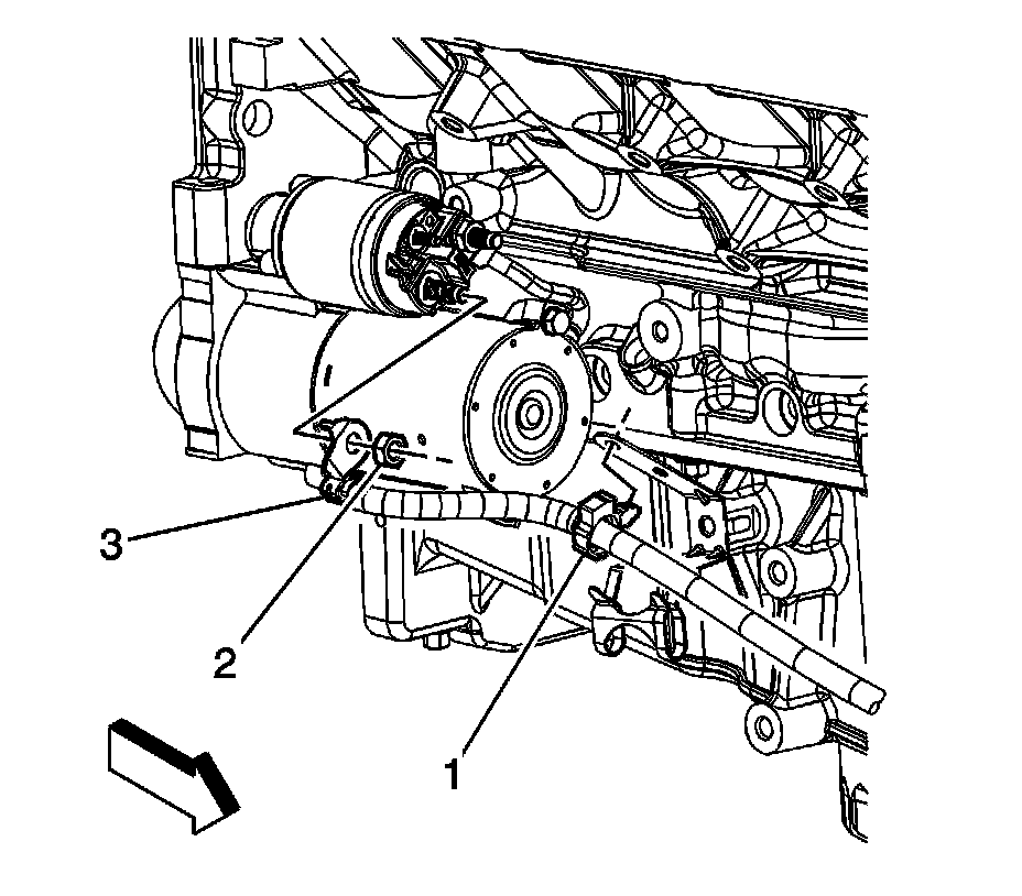 3. Install the positive battery cable terminal nut (2) to the starter.