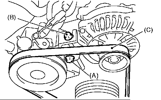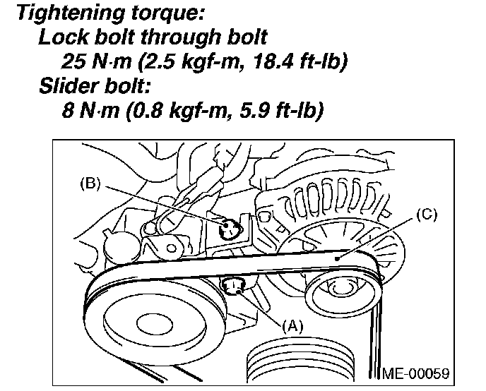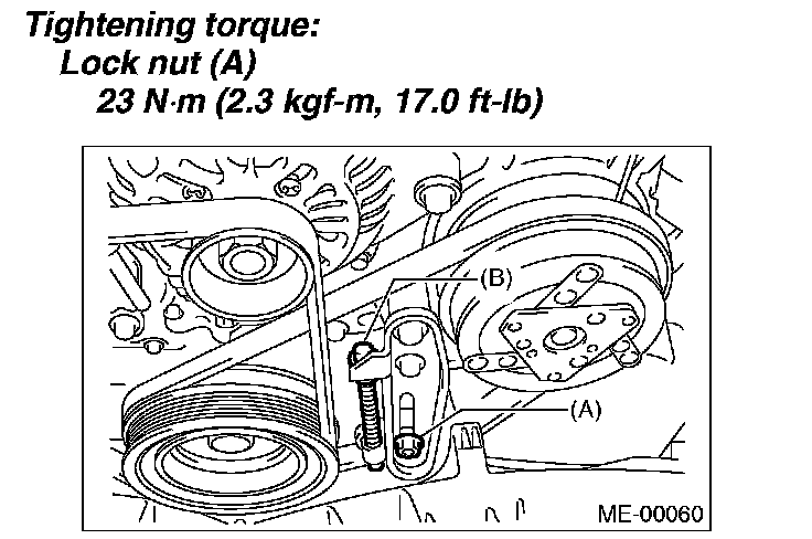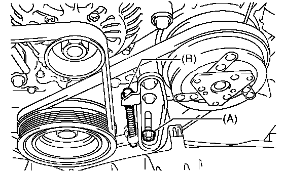1. Install the belt, and tighten the slider bolt (B) so as to obtain the specified belt tension.