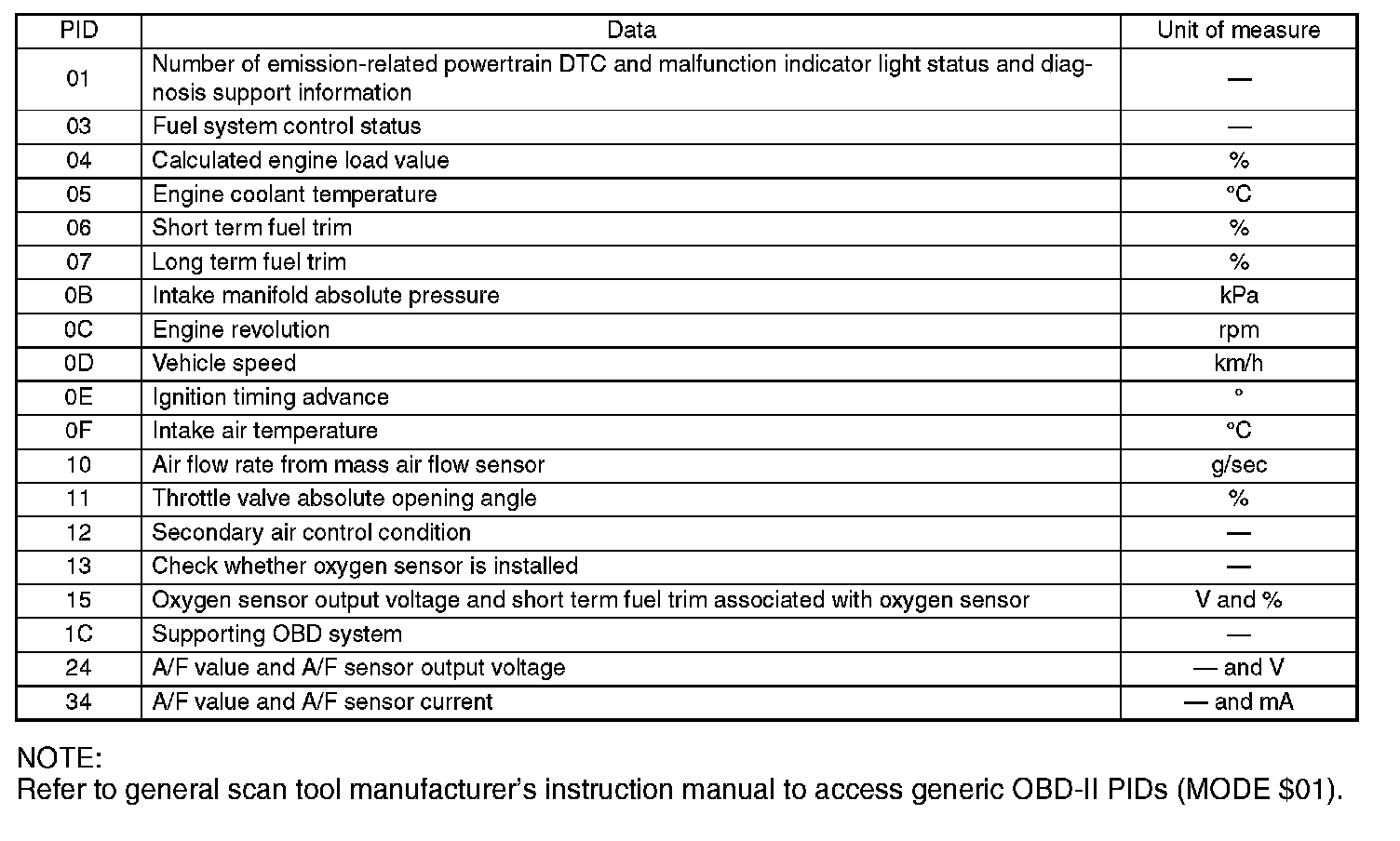 A list of the support data and PID (Parameter Identification) codes are shown in the table.