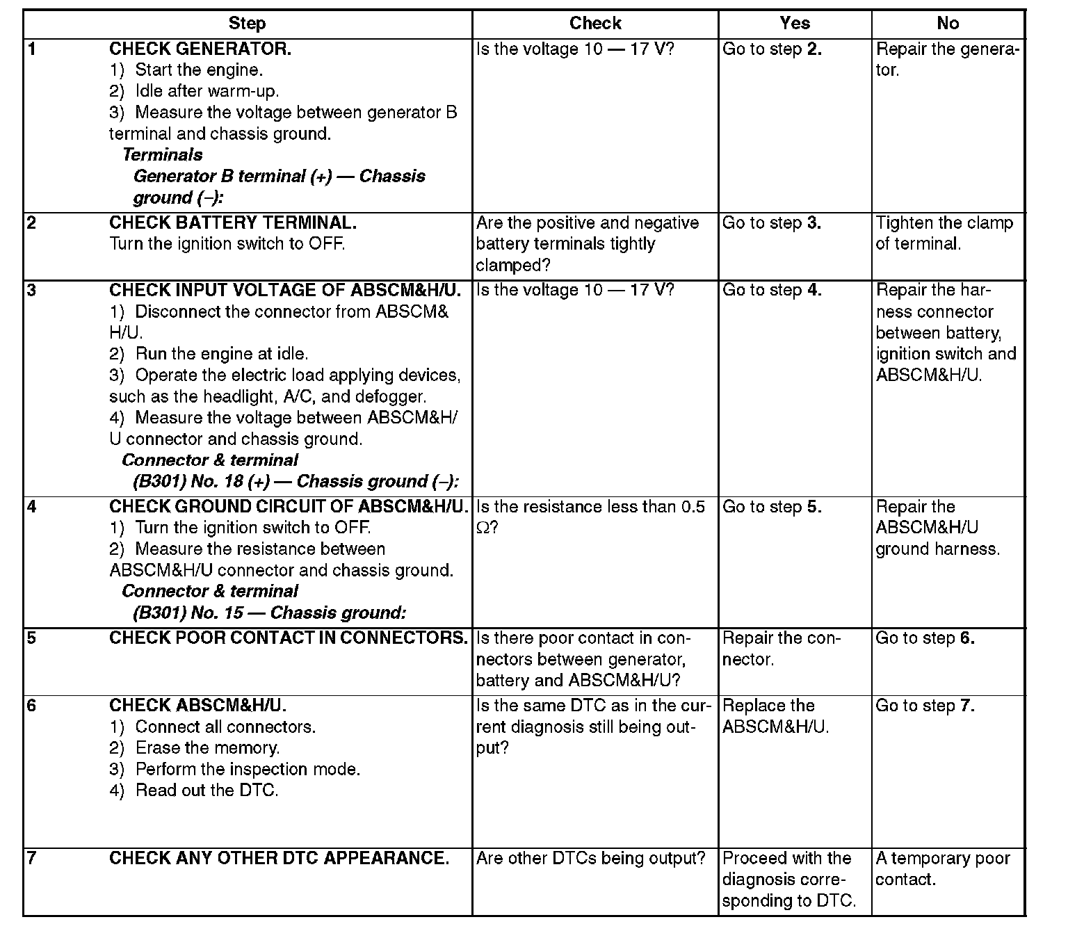 DTC 42 POWER VOLTAGE MALFUNCTIONDIAGNOSIS: Power voltage of the ABSCM&H/U is too low or too high.