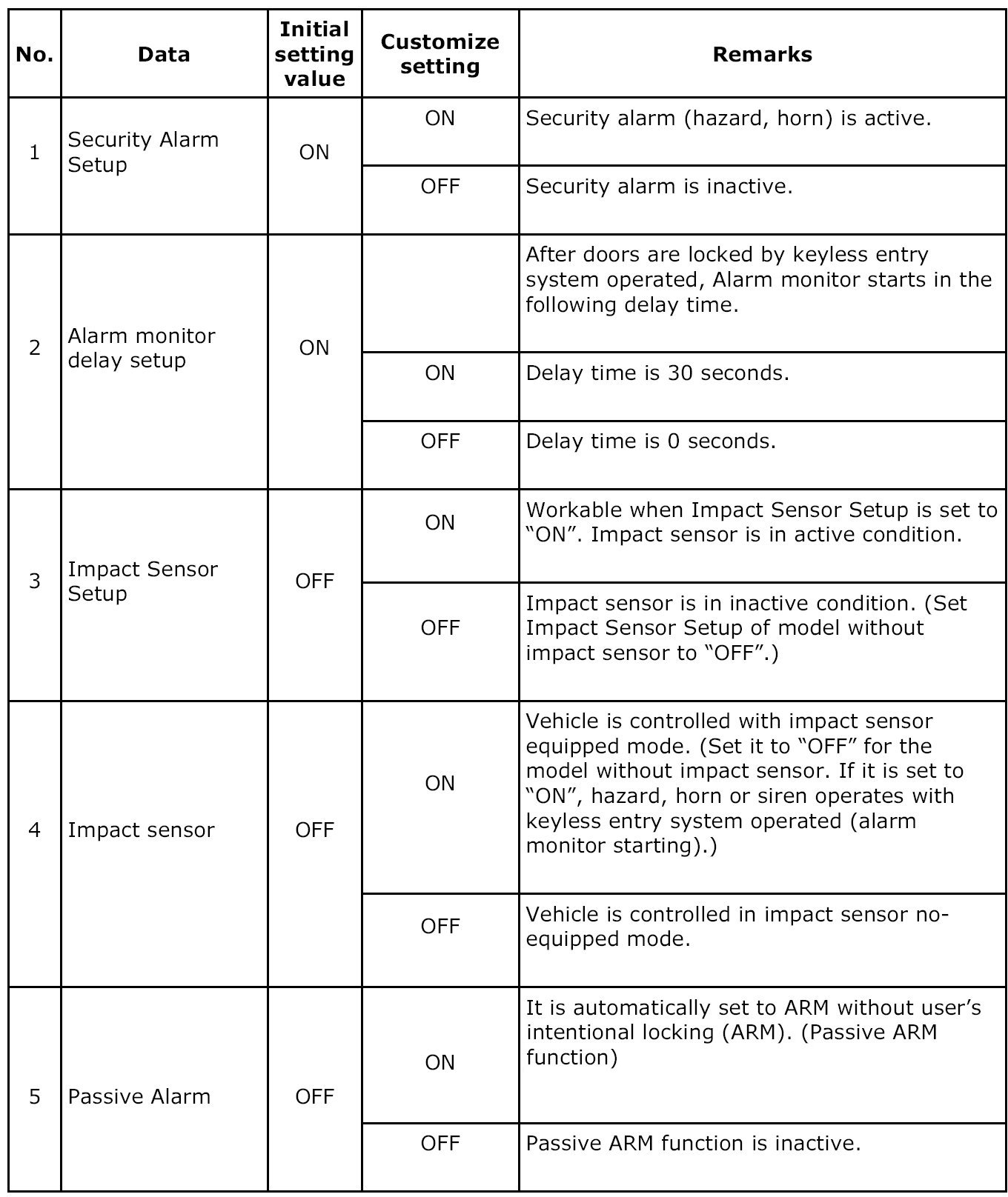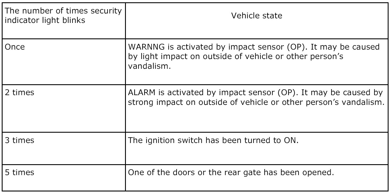 - If the ALARM/WARNING occurs in the ARM mode, the indicator light blinks when the ignition switch is turned to OFF -> ON at the next DISARM mode.