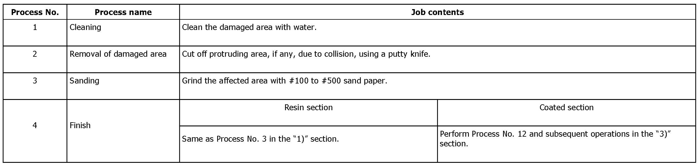 NOTE: All PP bumpers are provided with a grained surface, and if the surface is damaged, it cannot normally be restored to its former condition. Damage limited to shallow scratches that cause only a change in the lustre of the base material or coating, can be almost fully restored. Before repairing a damaged area, explain this point to the customer and get an understanding about the matter. Repair methods are outlined below, based on a classification of the extent of damage.