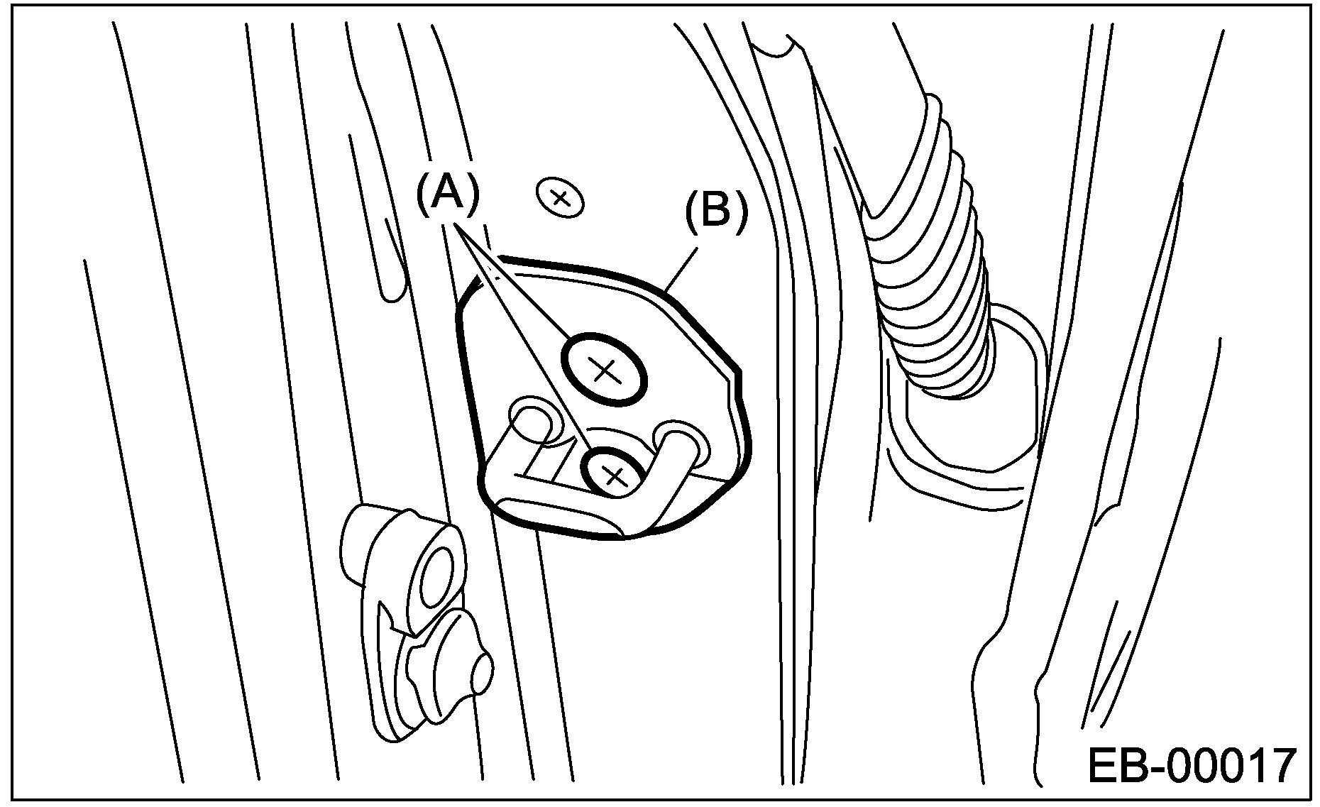 Loosen the screw (A) and tap striker (B) using a plastic hammer to adjust striker to align the position of front door panel laterally at the rear end.