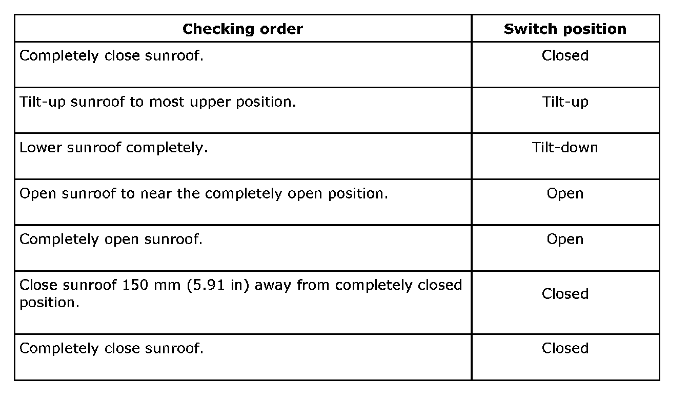 Check the sunroof operation with the procedure as shown in the table.