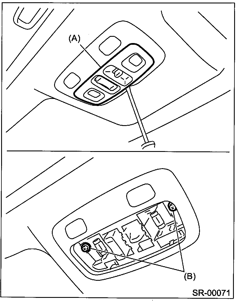 Remove the spot light lens (A) and sunroof switch mounting screw (B).
