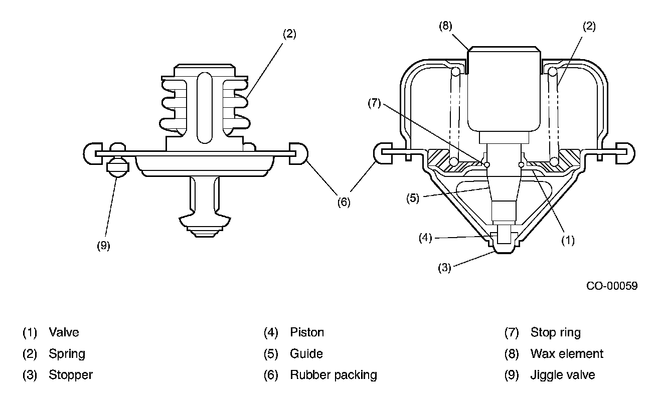 The thermostat has a totally enclosed wax pellet, which expands as the coolant temperature increases. It opens and closes accurately at the preset temperatures and features high durability.