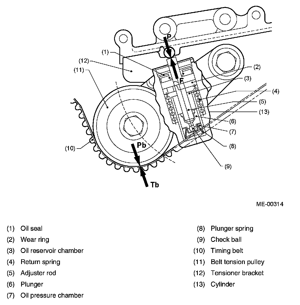 When the belt becomes slack, the adjuster rod is pushed upward by the return spring. The oil in the reservoir chamber, which is pressurized by the plunger spring to a certain level, pushes open the check ball and flows into the oil pressure chamber to keep the pressure constant. The thrust force F resulting from extension of the adjuster rod applies a counterclockwise torque to the tensioner bracket, which causes the belt tension pulley at its end to turn in the same direction. This applies tensioning pressure Pb to the timing belt.