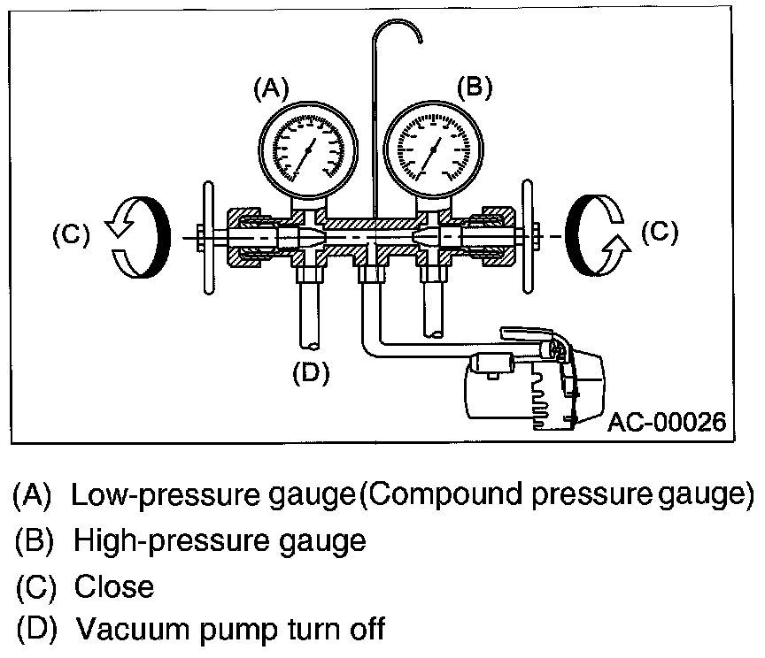 Close the valves on low-/high-pressure sides of the manifold gauge.