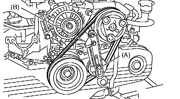 2. Install a V belt, and tighten the slider bolt (B) so as to obtain the specified belt tension.
