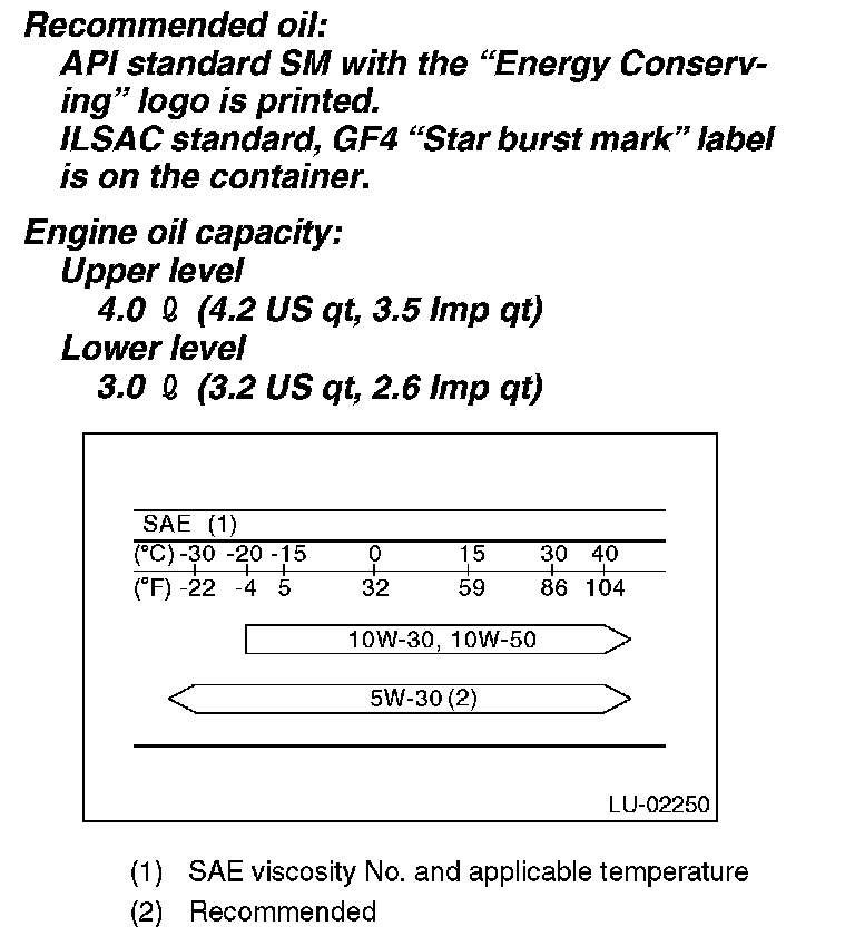 NOTE: If the vehicle is used in areas with very high temperatures or for other heavy duty applications, the following viscosity oils may be used: API standard: SM or SL