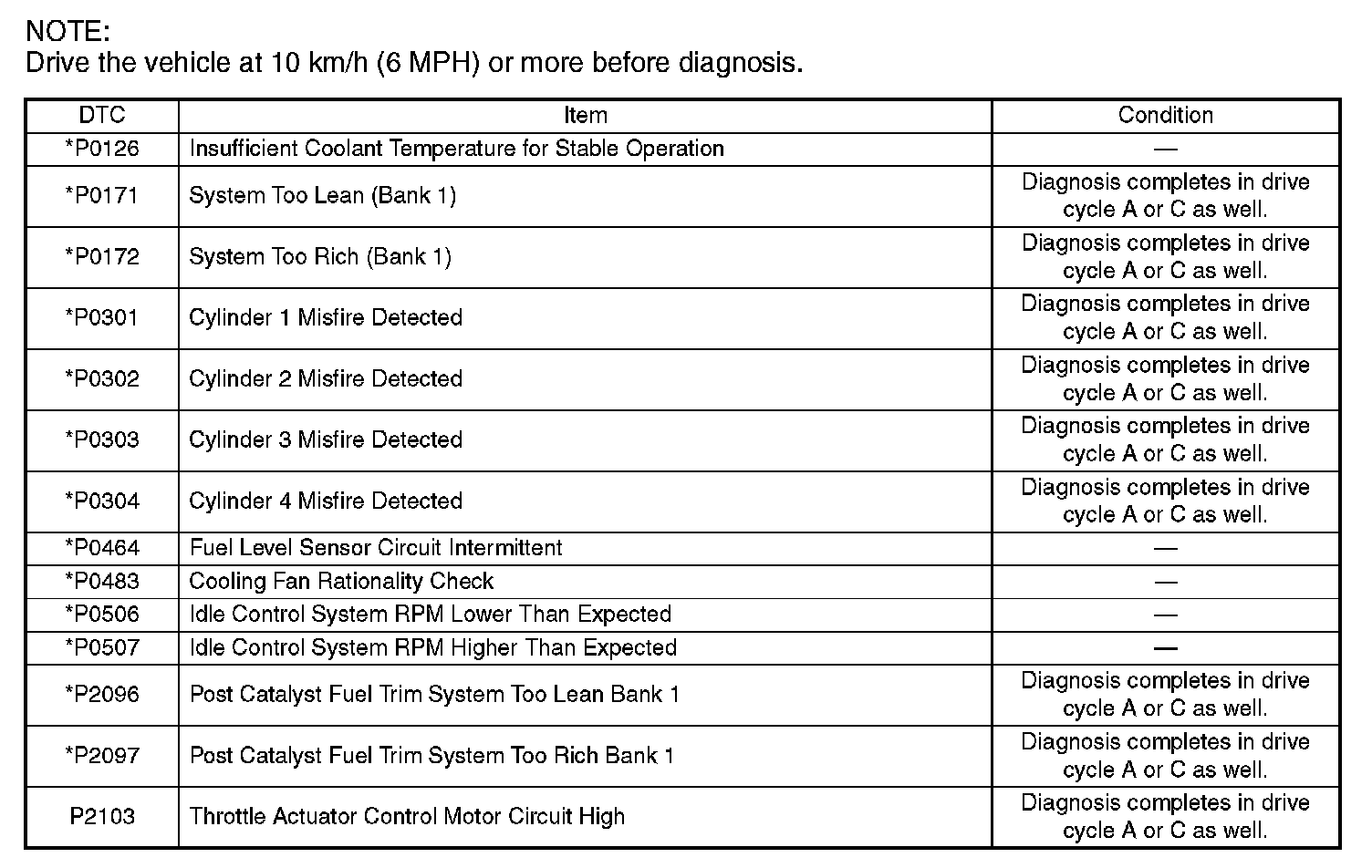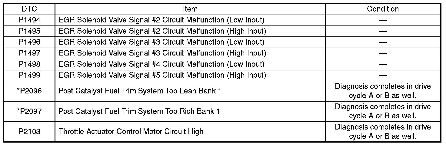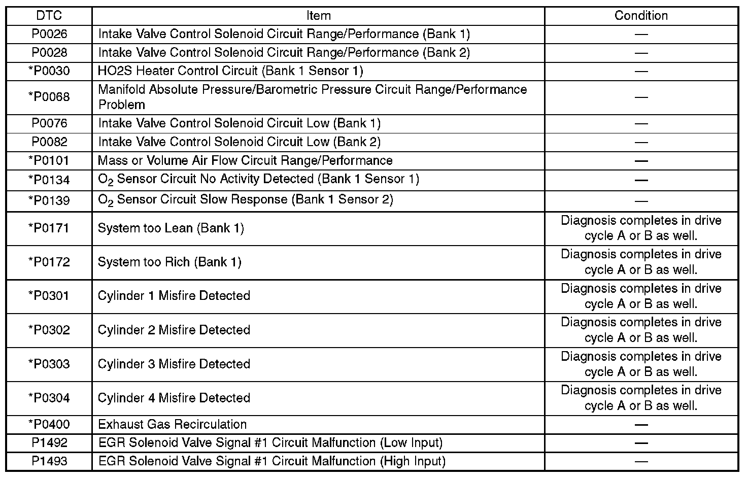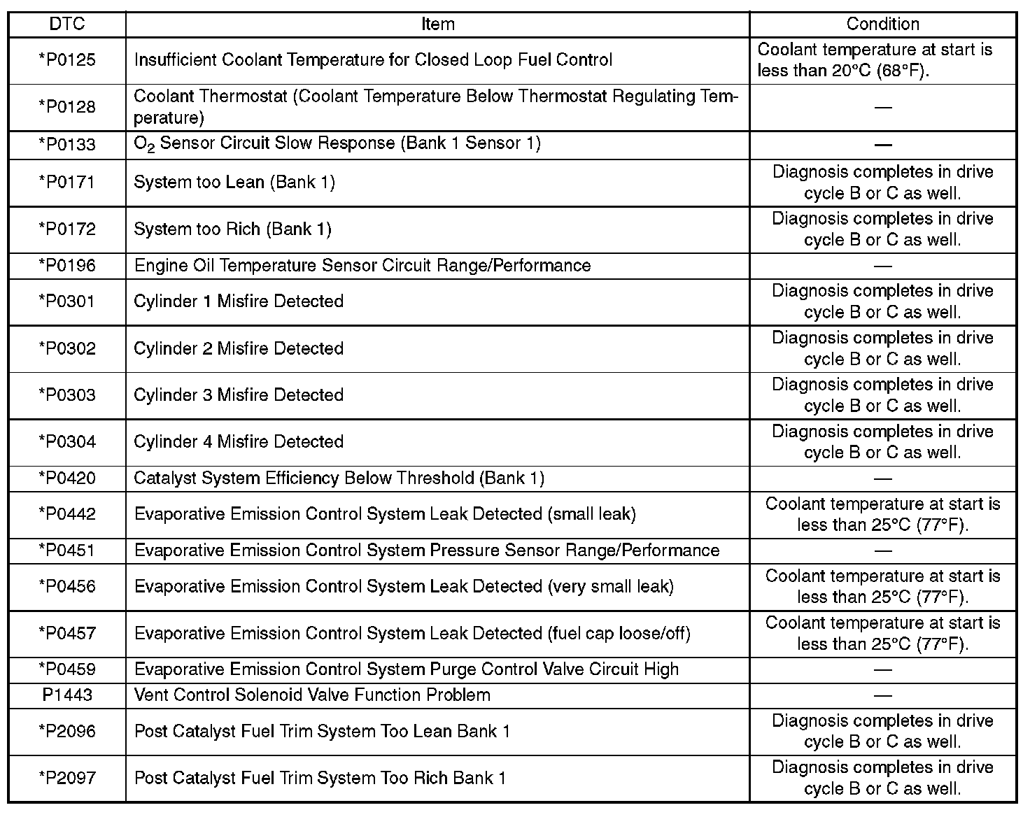 - Carry out the diagnosis which is marked * on DTC twice, then, after finishing first diagnosis, stop the engine and do second time at the same condition.
