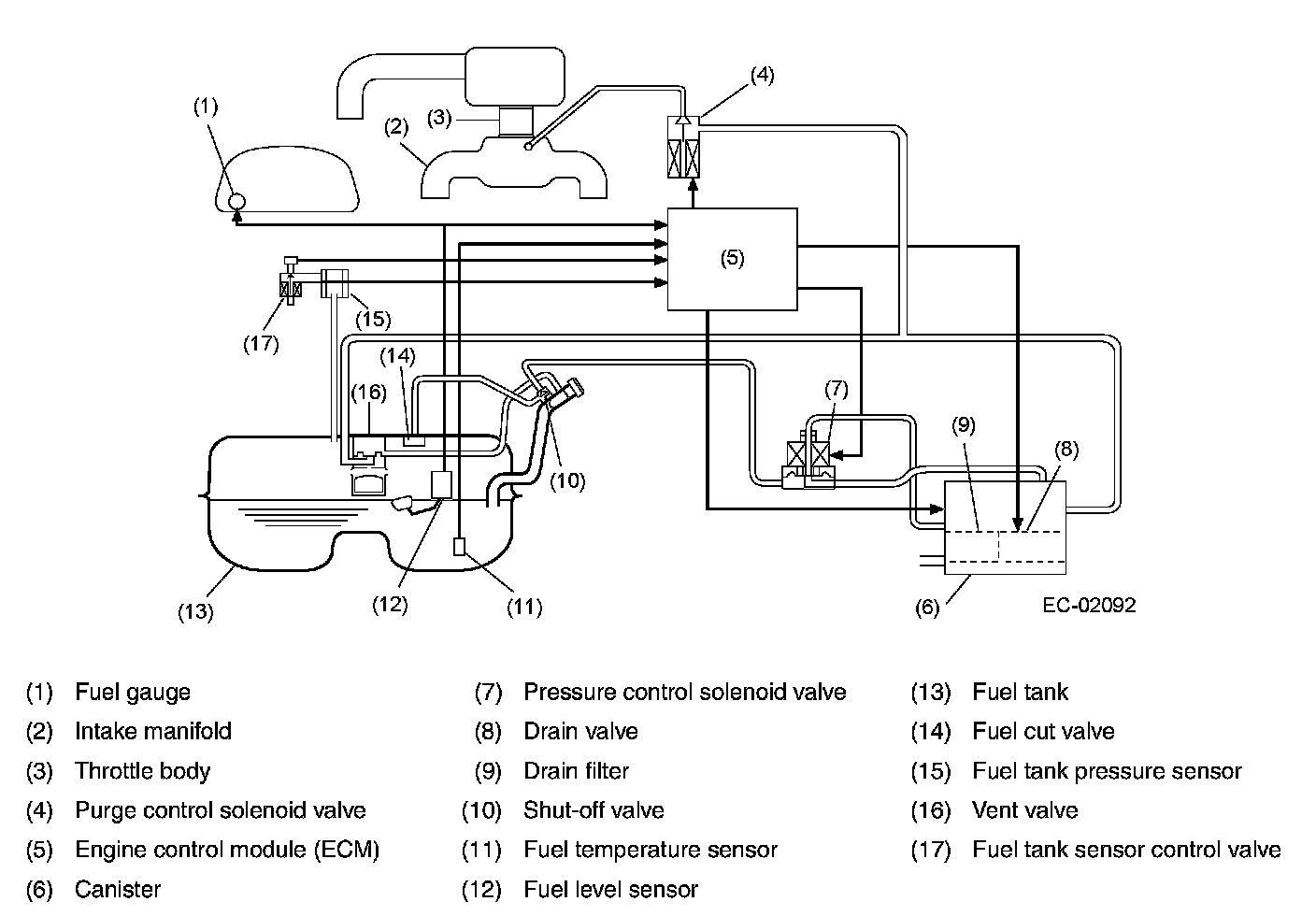 GENERAL^ The evaporative emission control system prevents fuel vapors from escaping into atmosphere. This system includes a canister, purge control solenoid valve, fuel cut valve, and the lines connecting them.
