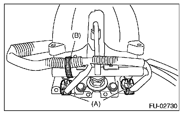 ^ Remove the harness band (B) which holds engine harness to fuel injector pipe.