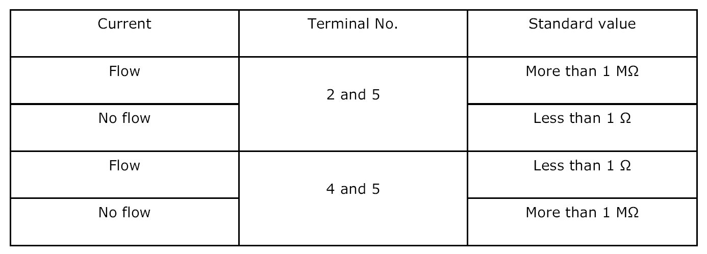 Measure the interrupt relay resistance between terminals (indicated in the table below) when connecting terminal No.3 to battery positive terminal and terminal No.1 to battery ground terminal.