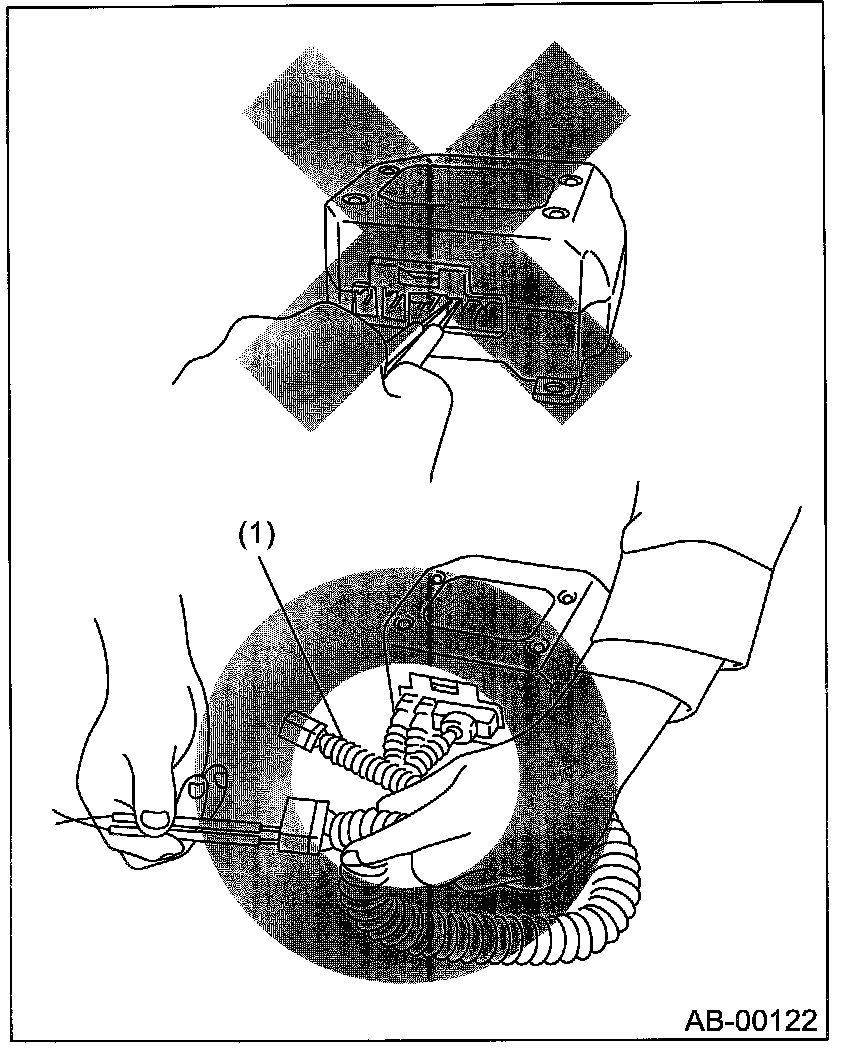 - When checking, use a test harness (1). Do not directly apply the tester probe to any connector terminal of the airbag. Damage to the connector terminal may cause the airbag to activate erroneously.