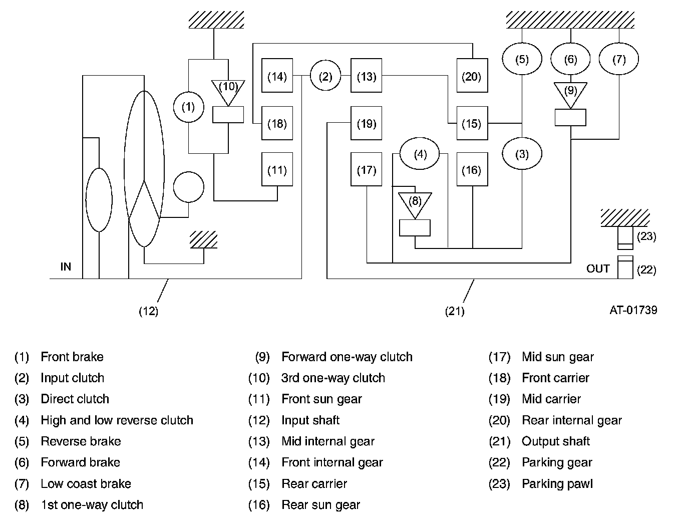 The gear train consists of three sets of planetary gears, three sets of multi-plate clutches, four sets of multi-plate brakes and three set of one-way clutches.