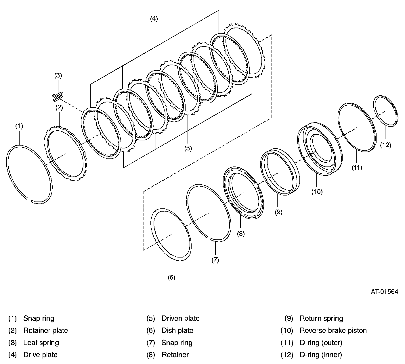CONSTRUCTIONThe reverse brake which consists of a reverse brake piston, return spring, dish plate, drive plates, driven plates and retaining plate, is placed in a housing formed in the transmission case.