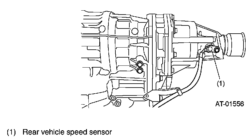 This vehicle speed sensor is a Hall element type sensor and is externally mounted on the extension case. It detects the rear wheel speed in terms of the peripheral speed of the rear drive shaft and sends pulse signals (22 pulses per rotation) to the TCM.