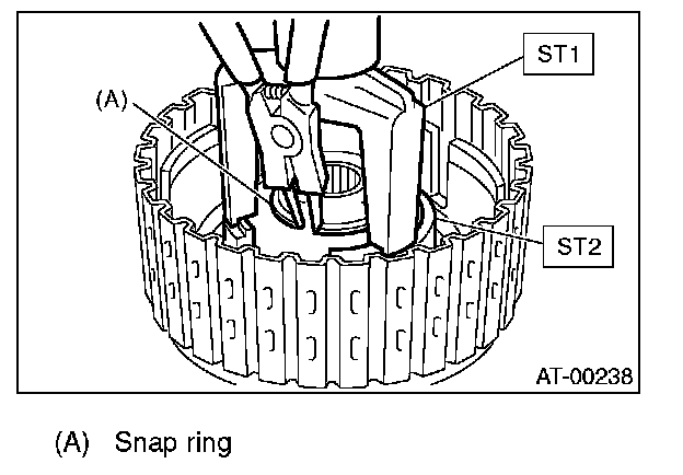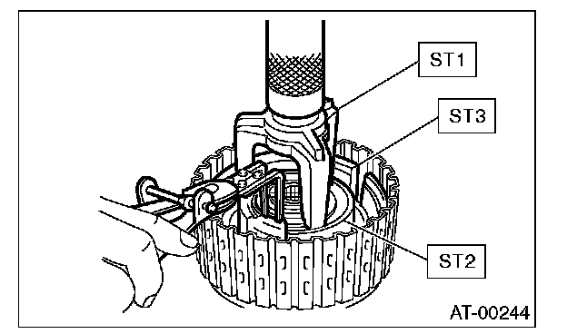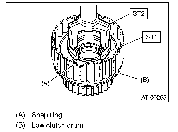 7. Compress the spring retainer, and remove the snap ring from the low clutch drum, by using ST1 and ST2.