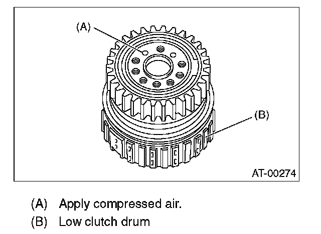 9. Install the one-way clutch inner race to the low clutch drum, and apply compressed air to remove the low clutch piston.