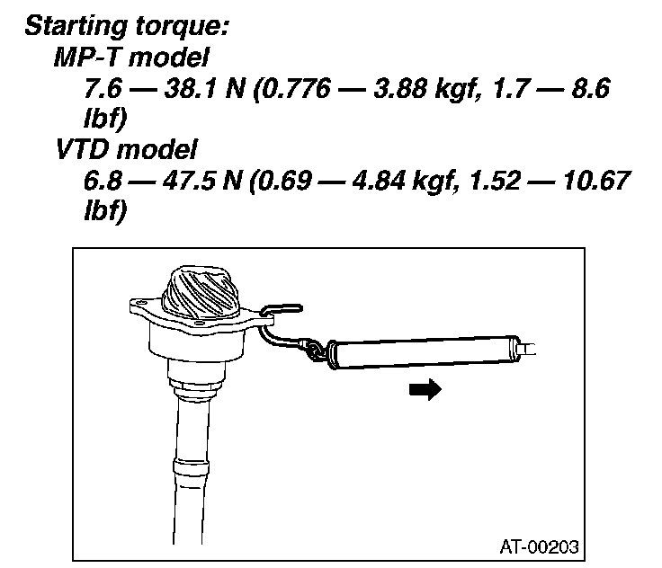 6. Measure the starting torque of the bearing. Make sure the starting torque is within the specified range. If out of the allowable range, replace the roller bearing.