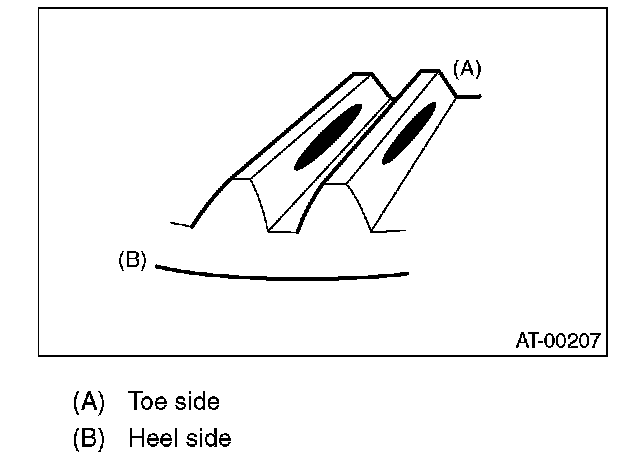Checking item: Tooth contact pattern is slightly shifted toward to toe side under no-load rotation. [When loaded, contact pattern moves toward heel.]