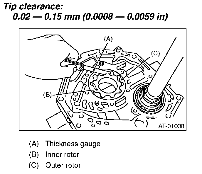 (1) Tip clearance Install inner rotor and outer rotor to oil pump. With rotor gears facing each other, measure crest-to-crest clearance.