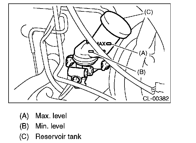 2. Inspect the fluid level using scale on the outside of the reservoir tank. If the level is below "MIN", add fluid to bring it up to "MAX", and also inspect for leakage.
