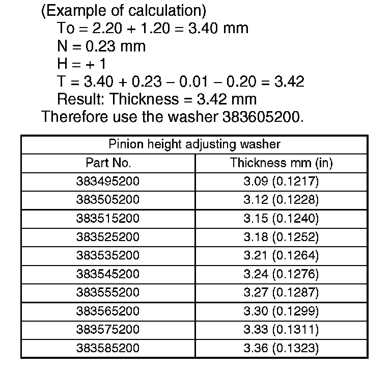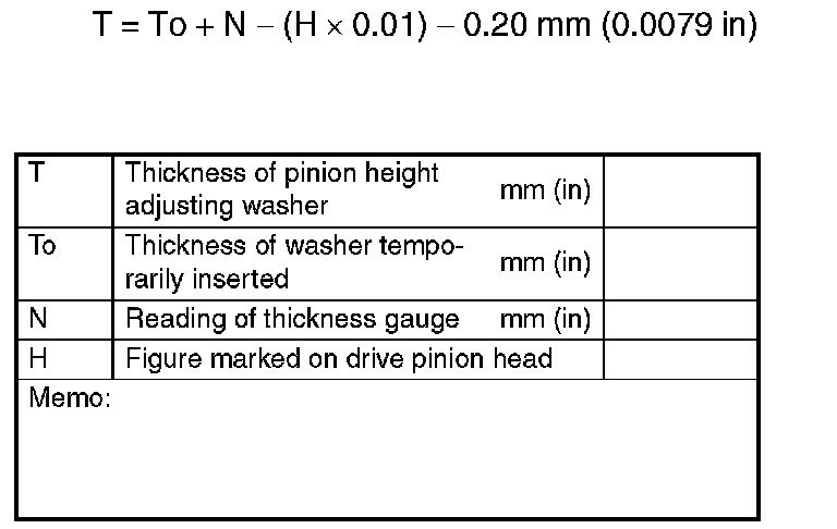 (3) Obtain the thickness of pinion height adjusting washer to be inserted from the following formula, and replace the temporarily installed shim with this one.