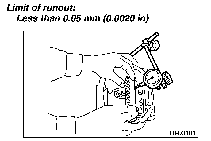 17. Check the hypoid driven gear runout on its back surface, and make sure that pinion and hypoid driven gear rotate smoothly.