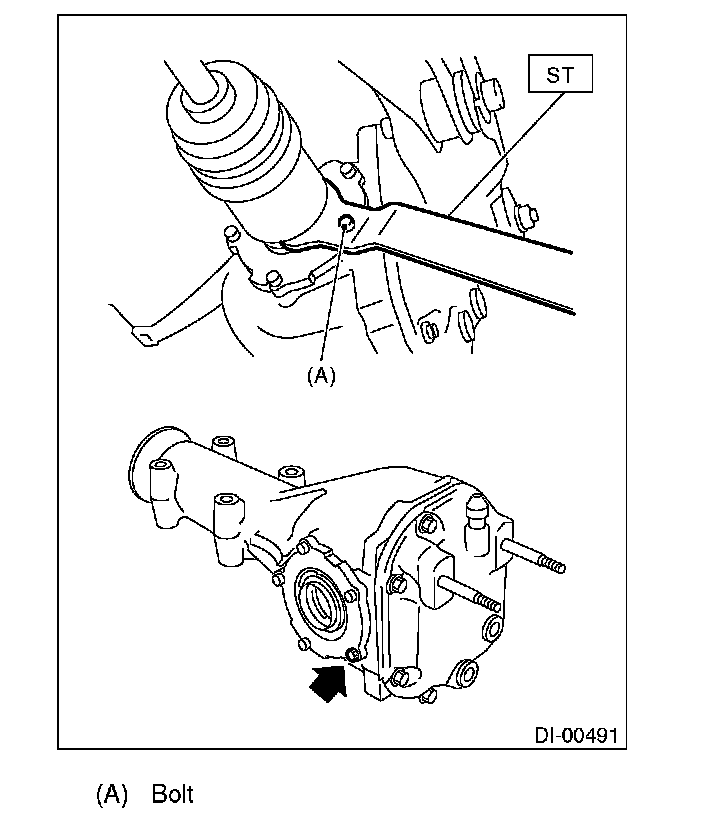 When removing the DOJ from rear differential, fit ST to the bolts as shown in the figure so as not to damage the side bearing retainer.