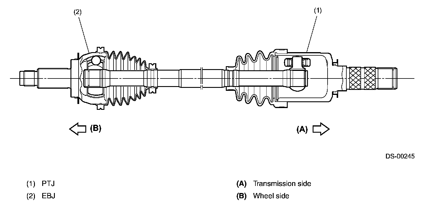 FRONT DRIVE SHAFT^ The spline connection between the transmission side axle drive axle shaft and joint is abolished and changed to an integrated structure. PTJ (Pillow Tripod Joint) type joints are newly used at the transmission side, and light and compact EBJ (High Efficiency Compact Ball Fixed Joint) type joints are used at the wheel side.